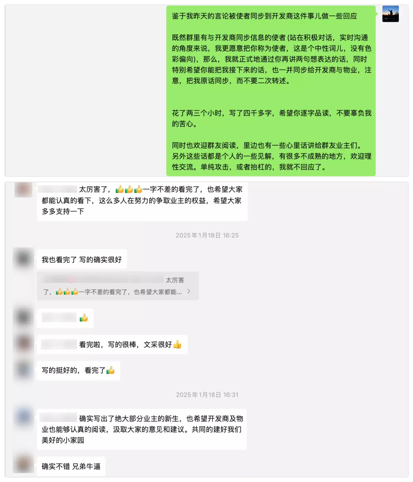 彼时我们大部分内容都在微信群沟通,然而这个微信群的成员也并不纯粹,里边的内容基本上也都实时被转发到开发商,鉴于这一现状,我奋笔疾书,写下近五千字的针对我昨天的言论被使者同步给开发商这件事儿做一些回应 (opens new window),同时发布到群里边,受到了广大业主的认可与肯定。