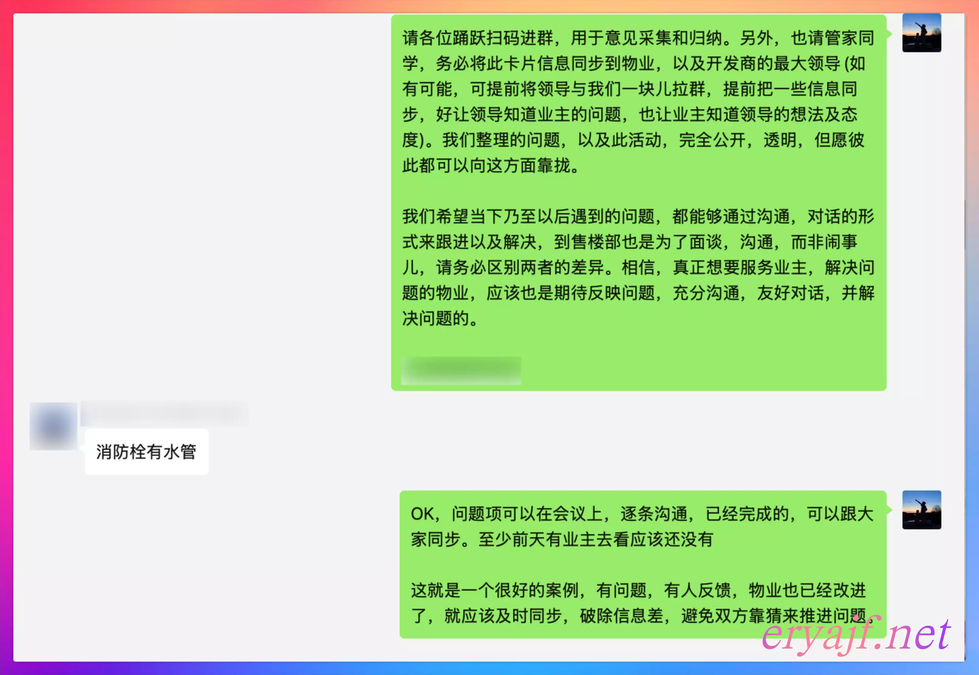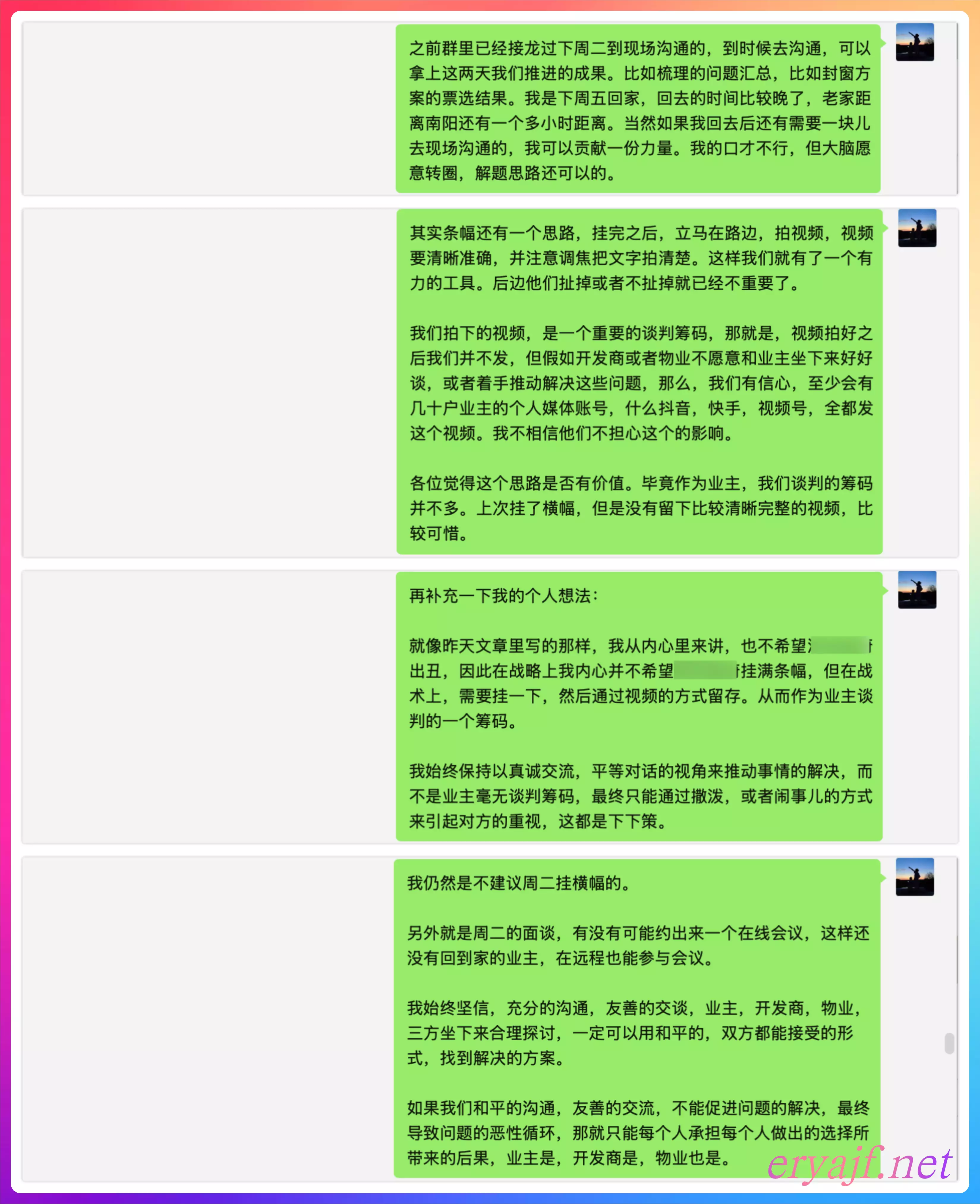 上图所言:希望看到此条消息的物业、开发商相关通知、领导,能够提早做好充分准备,面对业主提出的问题做到不回避,不敷衍,积极配合和解决。这是何等的胸怀与气魄,同时在往楼栋群里同步的时候,我还有如下附言:
