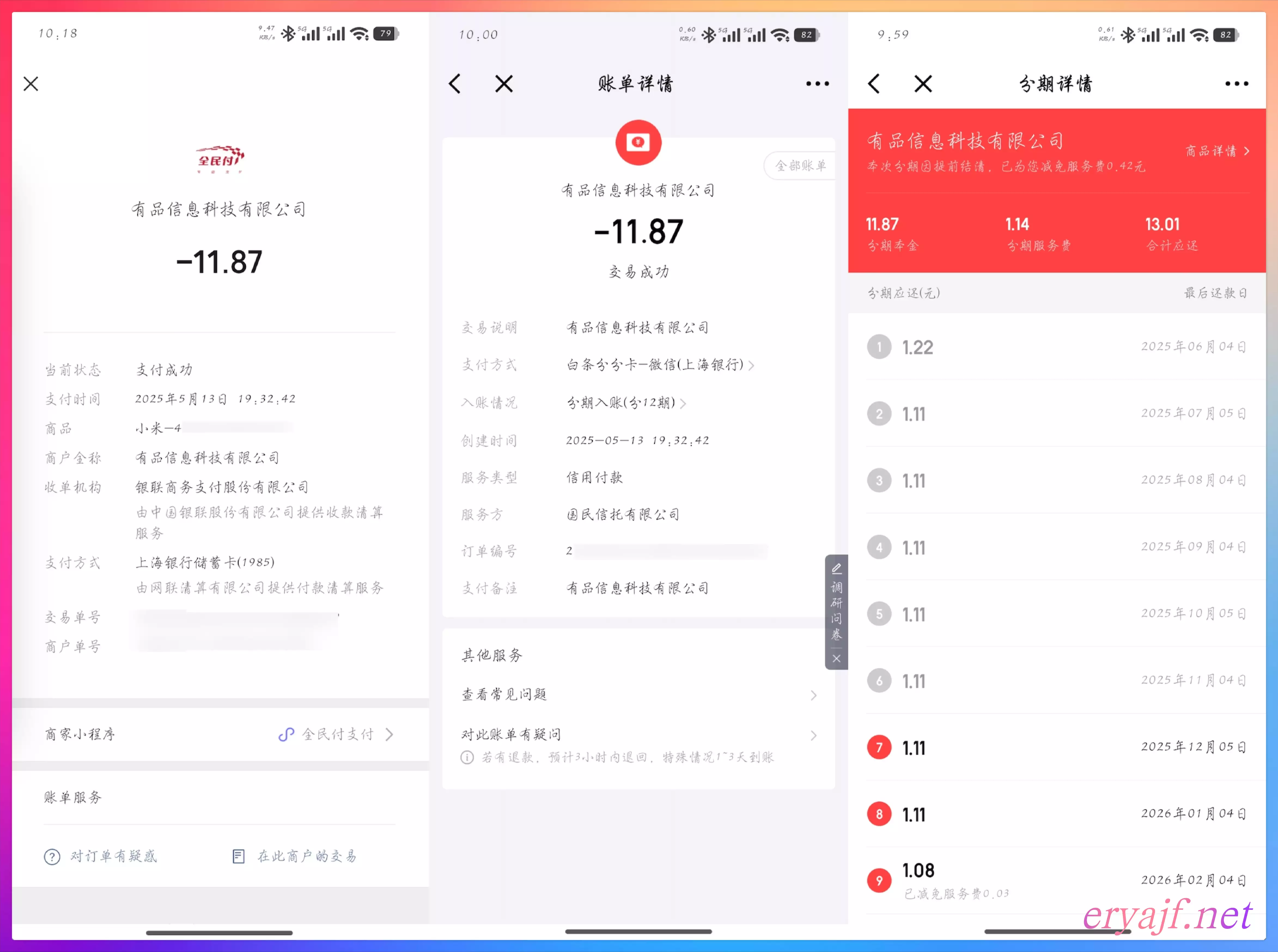 再来仔细看一看上边在小米有品消费的 11 元,这笔消费我当时选择的是微信支付,整个过程自然没有什么问题,但就在没有什么问题的支付链背后,有人悄悄做了恶。左图是微信账单,可以看到只是一笔普通购物消费,使用的支付方式为上海银行储蓄卡。中图是京东白条的账单,乍一看也没什么毛病,但能看到支付方式变成了白条分分卡,入账形式变成了分期入账,单单在这个页面,也看不出来有什么问题。你必须要进入到右图,分期详情中,才能看到,原来自己的一笔普通消费,在这里变成了有息分期消费。