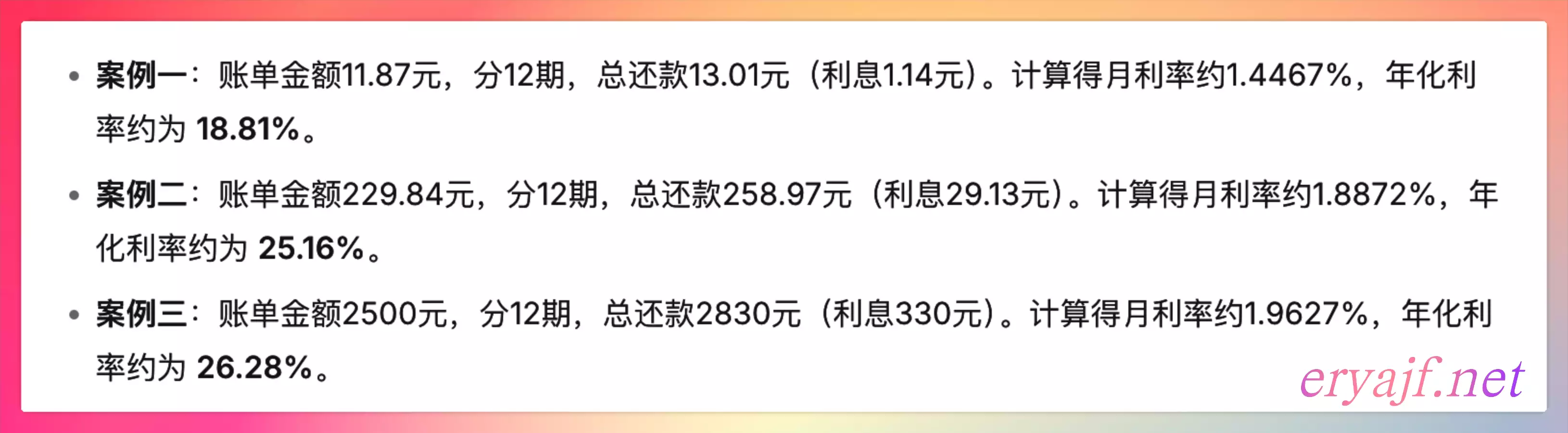 关于利息的利率换算我并不懂,这里用我实际的三个账单案例,给到 ds 计算,得到的结论如下,可供参考: