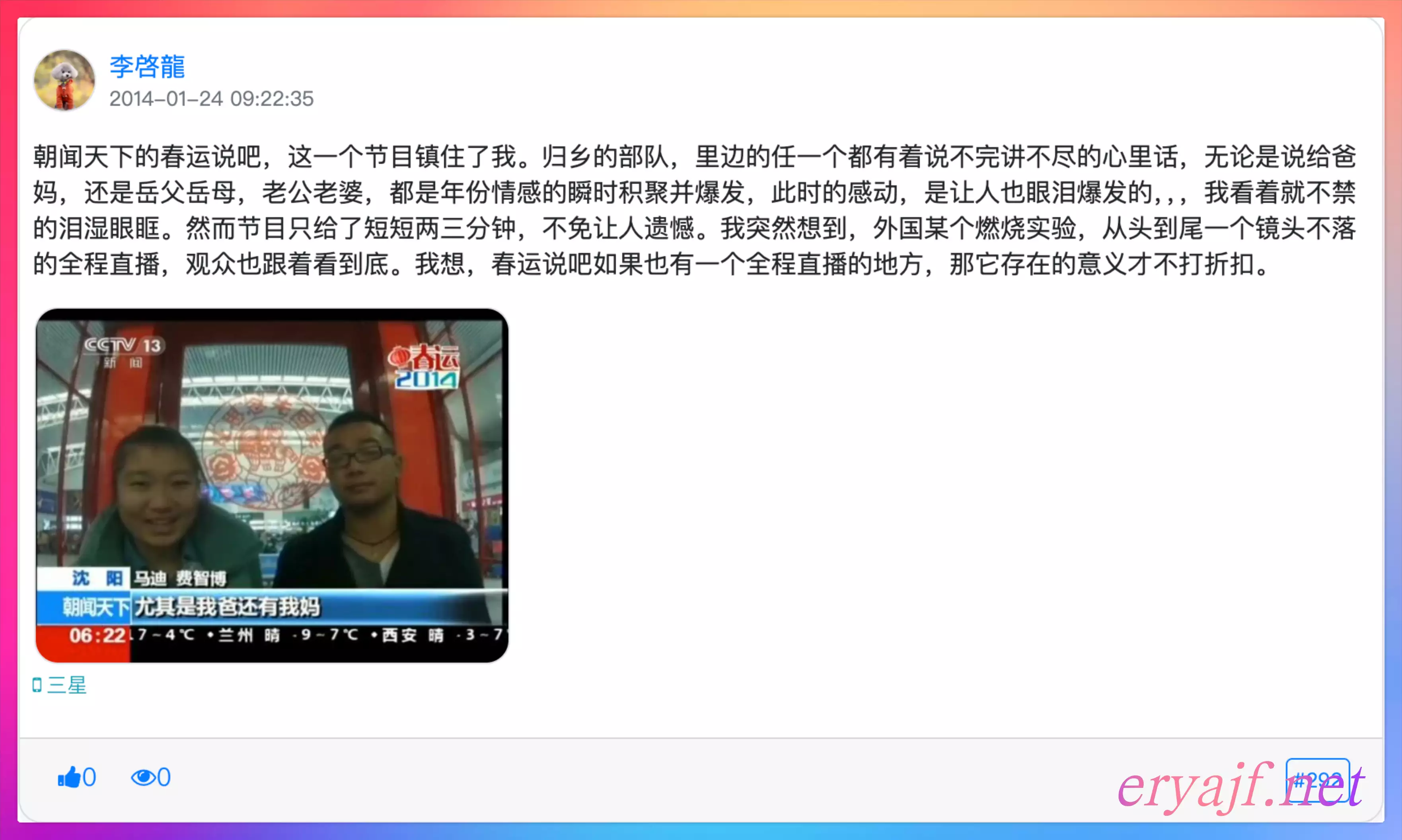 朝闻天下的春运说吧,这一个节目镇住了我。归乡的部队,里边的任一个都有着说不完讲不尽的心里话,无论是说给爸妈,还是岳父岳母,老公老婆,都是年份情感的瞬时积聚并爆发,此时的感动,是让人也眼泪爆发的,,,我看着就不禁的泪湿眼眶。然而节目只给了短短两三分钟,不免让人遗憾。我突然想到,外国某个燃烧实验,从头到尾一个镜头不落的全程直播,观众也跟着看到底。我想,春运说吧如果也有一个全程直播的地方,那它存在的意义才不打折扣。