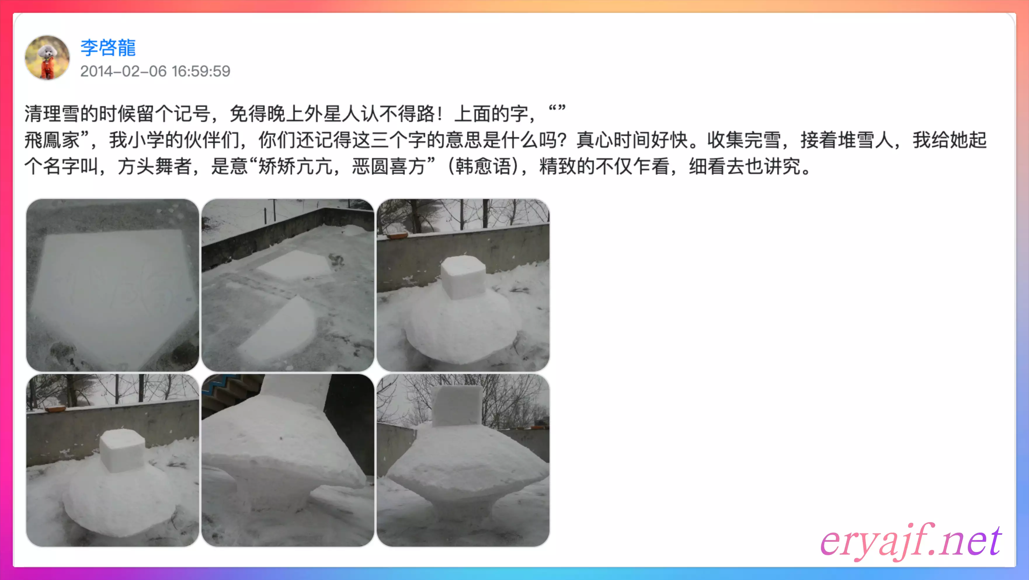 清理雪的时候留个记号,免得晚上外星人认不得路!上面的字,“飛鳯家”,我小学的伙伴们,你们还记得这三个字的意思是什么吗?真心时间好快。收集完雪,接着堆雪人,我给她起个名字叫,方头舞者,是意“矫矫亢亢,恶圆喜方”(韩愈语),精致的不仅乍看,细看去也讲究。