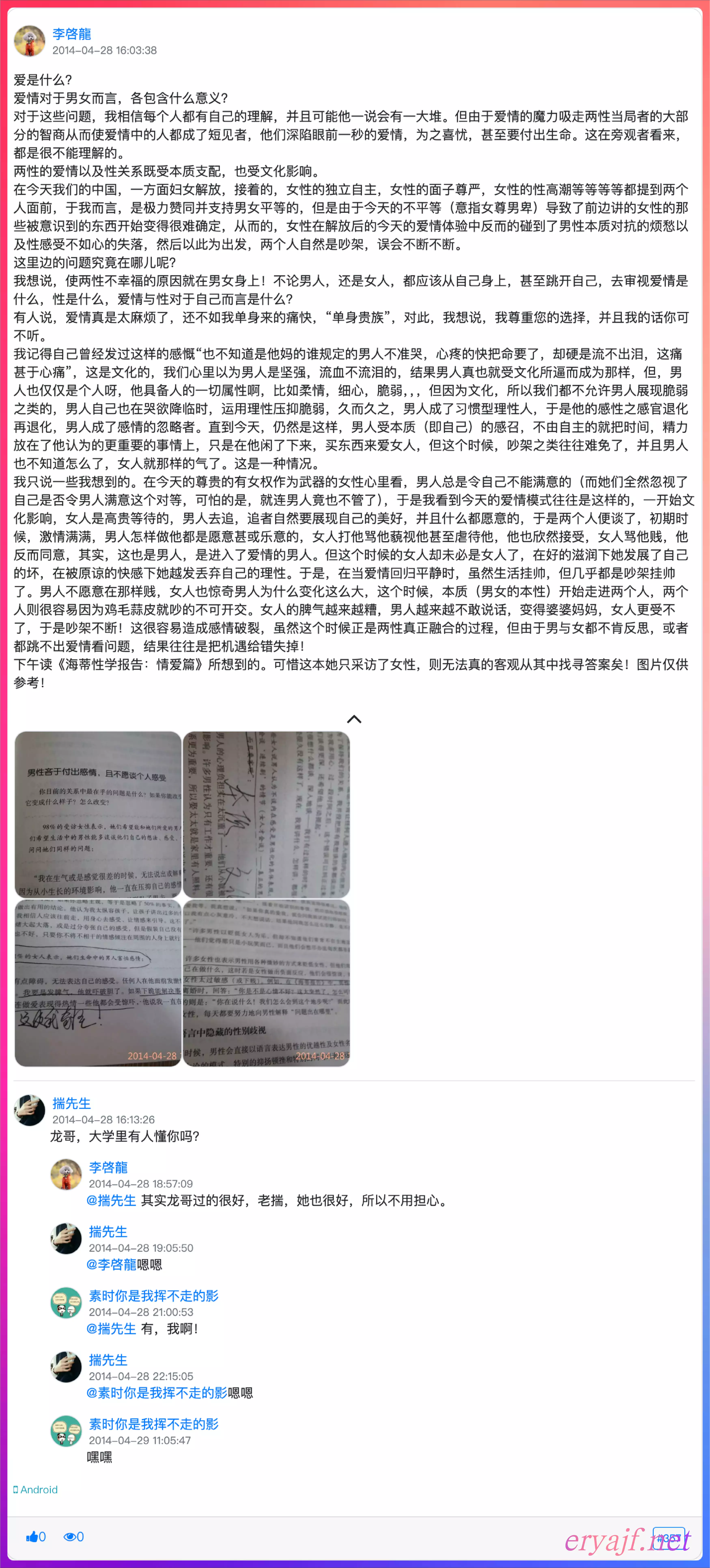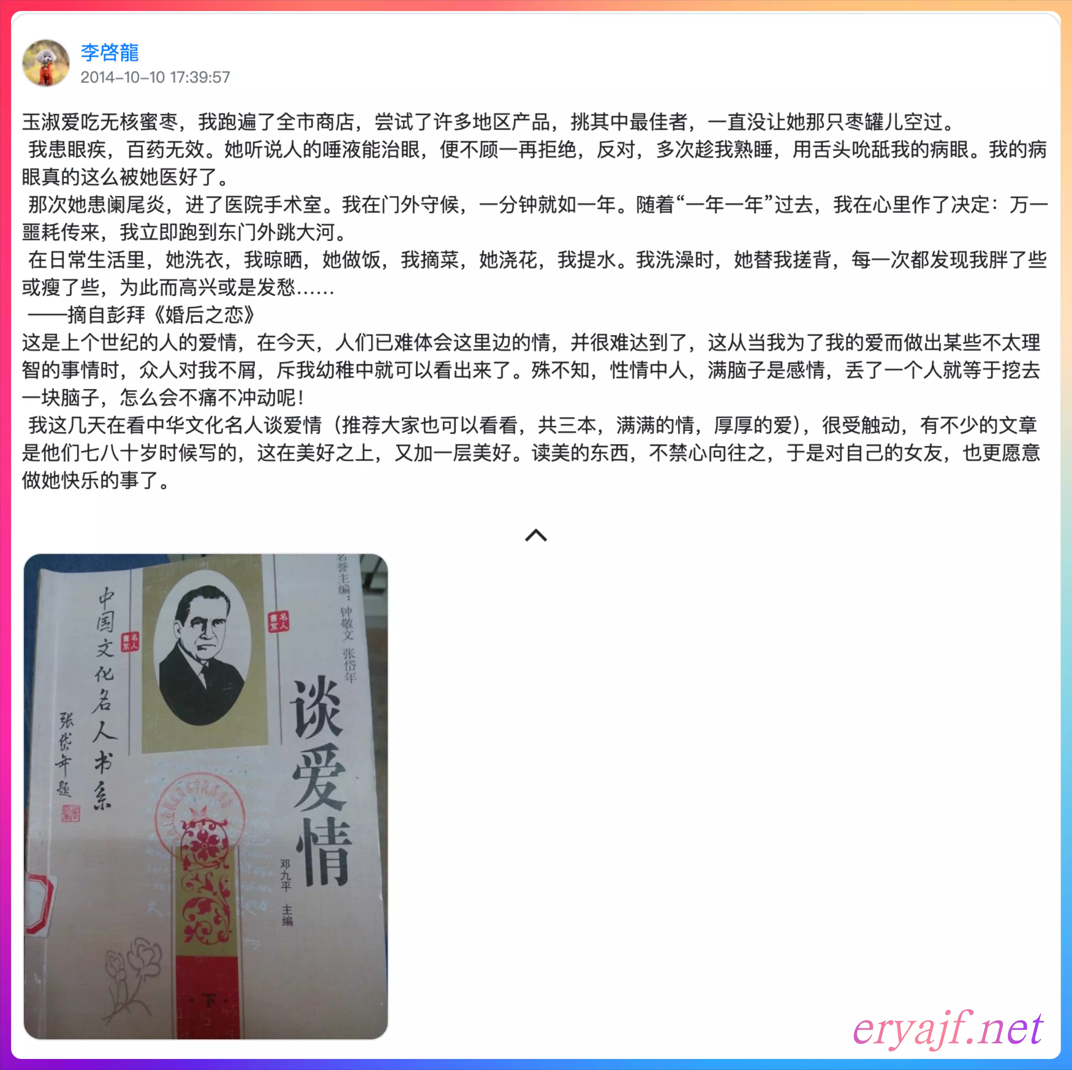 李敖说,我认为男欢女爱是人类最大的快乐,这种快乐,是纯快乐,不该掺进别的,尤其不该掺进痛苦.过去胡适之先生给朋友写扇面,他写--爱情的代价是痛苦,爱情的方法是忍受痛苦。我认为他全错了,在爱情上痛苦是一种眼光狭小的表示,一种发生了技术错误的表示.真正的第一流的人,是不为爱情痛苦的,像一位外国诗人所说的-