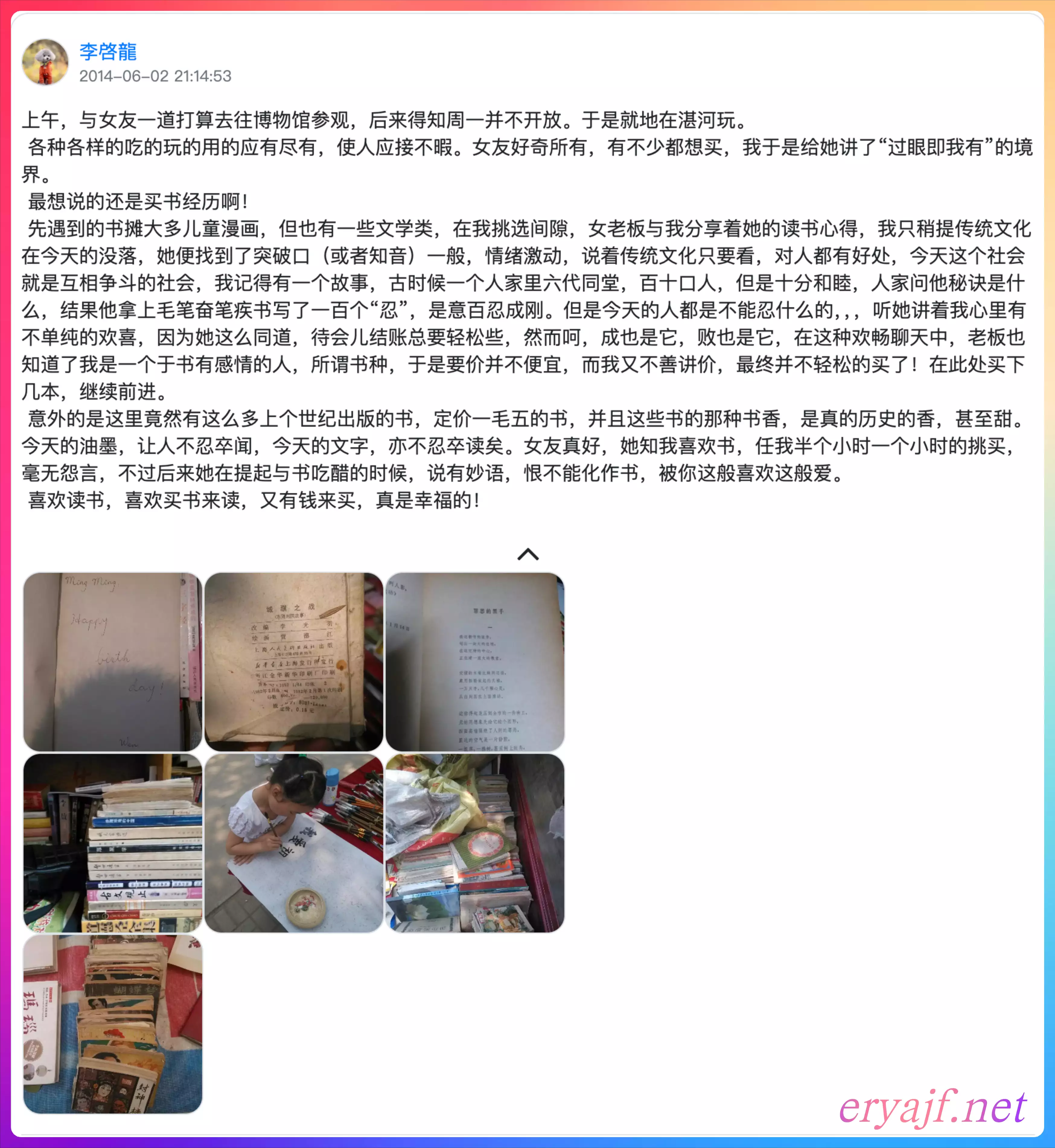 现在我学了传统文化,忽然发现自己当时是多么的糊涂,多么的忤逆。《弟子规》讲“亲所好,力为具”,可我呢,只自私的顾及自己的内心,非但没有力为具,反而去责怨爷爷不解自己的心,不解且不解罢,反过来却以喝酒排遣,这种糊涂,这种无知,让现在的我想起来都觉得脸红,可怕。另外一个,自己是学了一些文化,爷爷是没多少文化,但却以破坏艺术来思想爷爷的行为,这难道不是书呆子的表现吗?