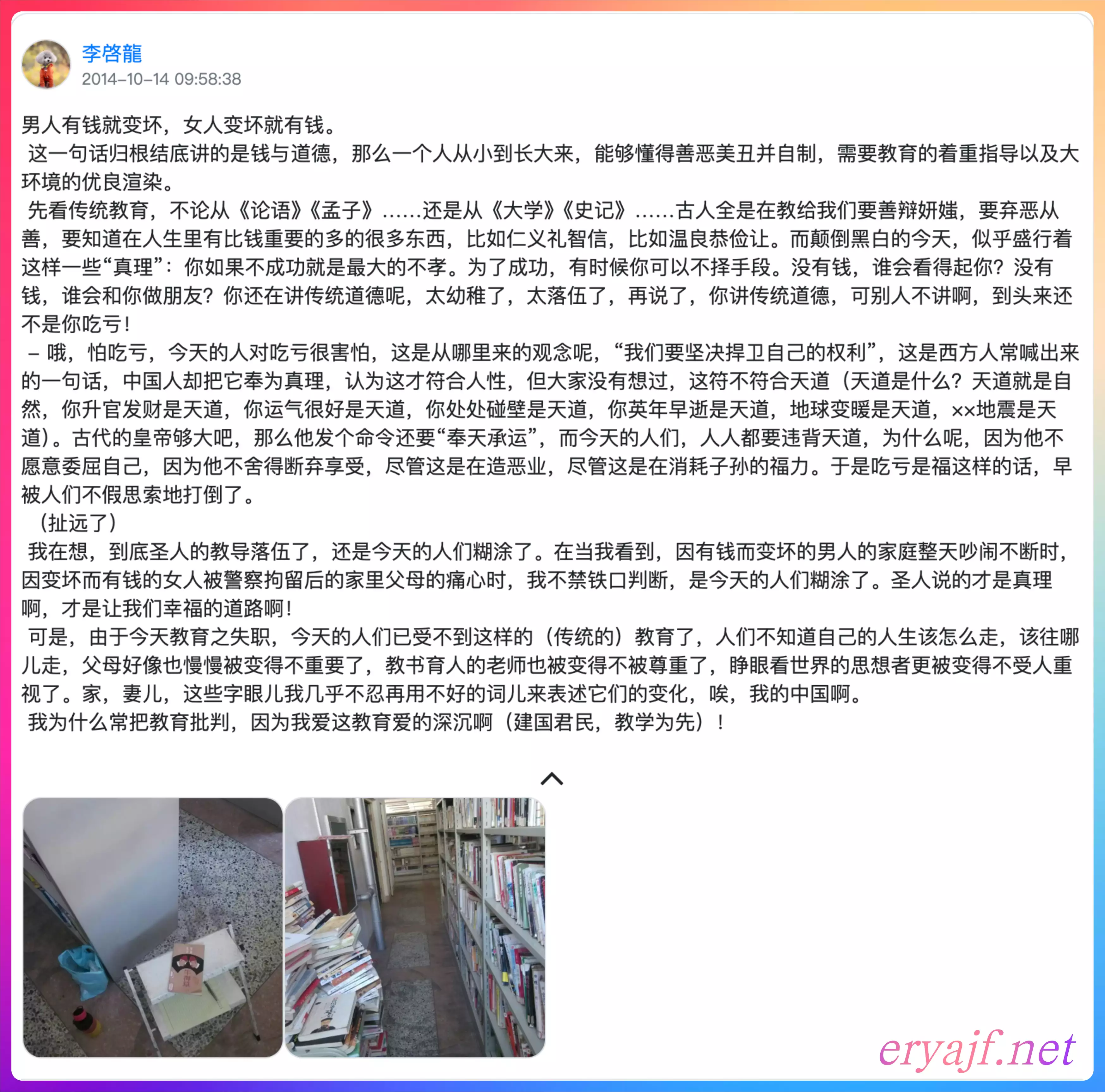 只有好学的先生才能有好学的学生,如今先生们鲜有图书馆常客的,于是,教育也可想而知。 唉,许多话也许没必要说,因为那些听不进去的说了也白说,那些知道利害的不用说人家就知道。