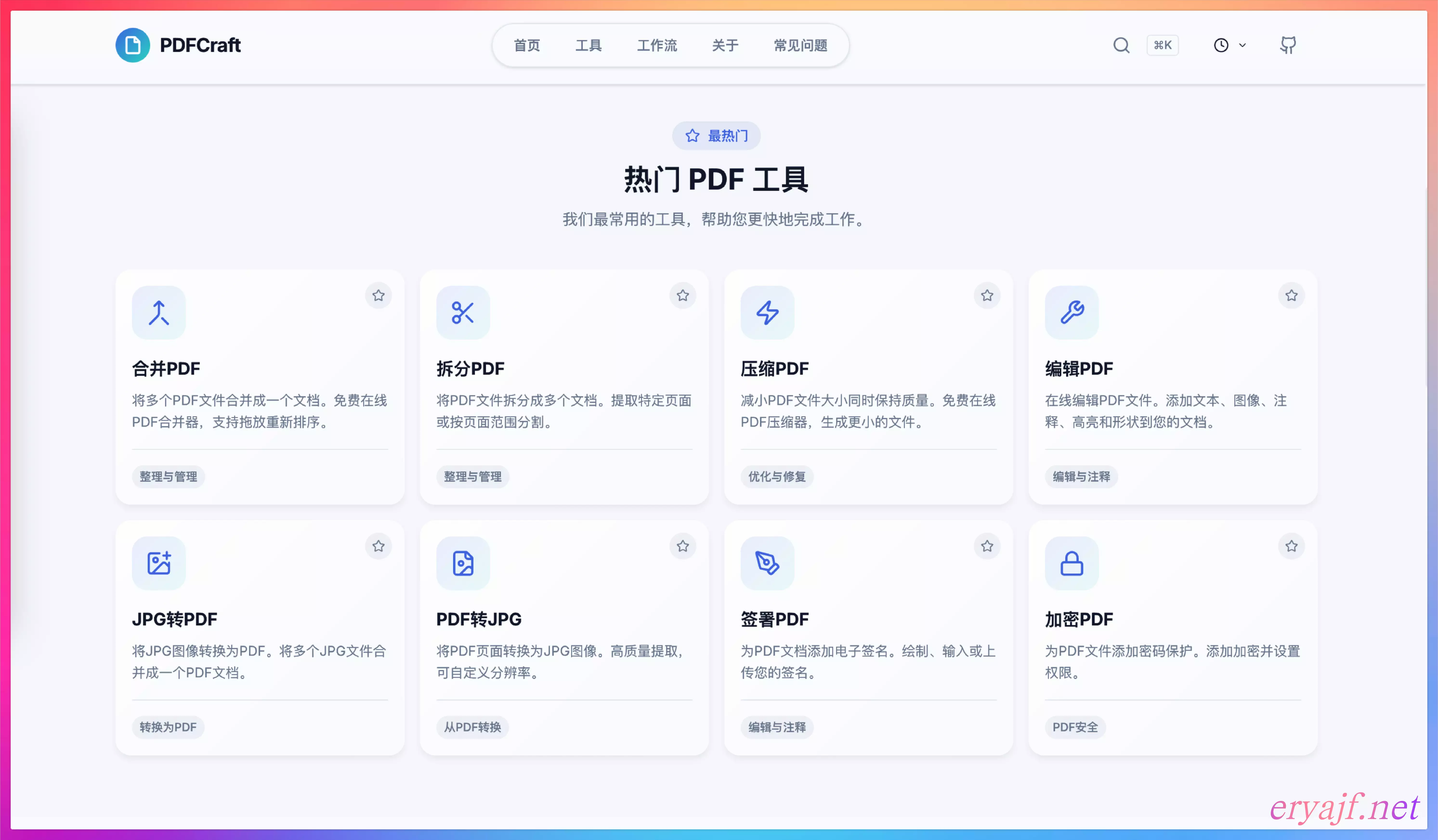 - 项目说明:一个免费、注重隐私的 PDF 工具包,完全在您的浏览器中运行。拥有 95+ 个专业工具,您可以编辑、转换、合并、分割和保护您的 PDF 文件,而无需将其上传到任何服务器。