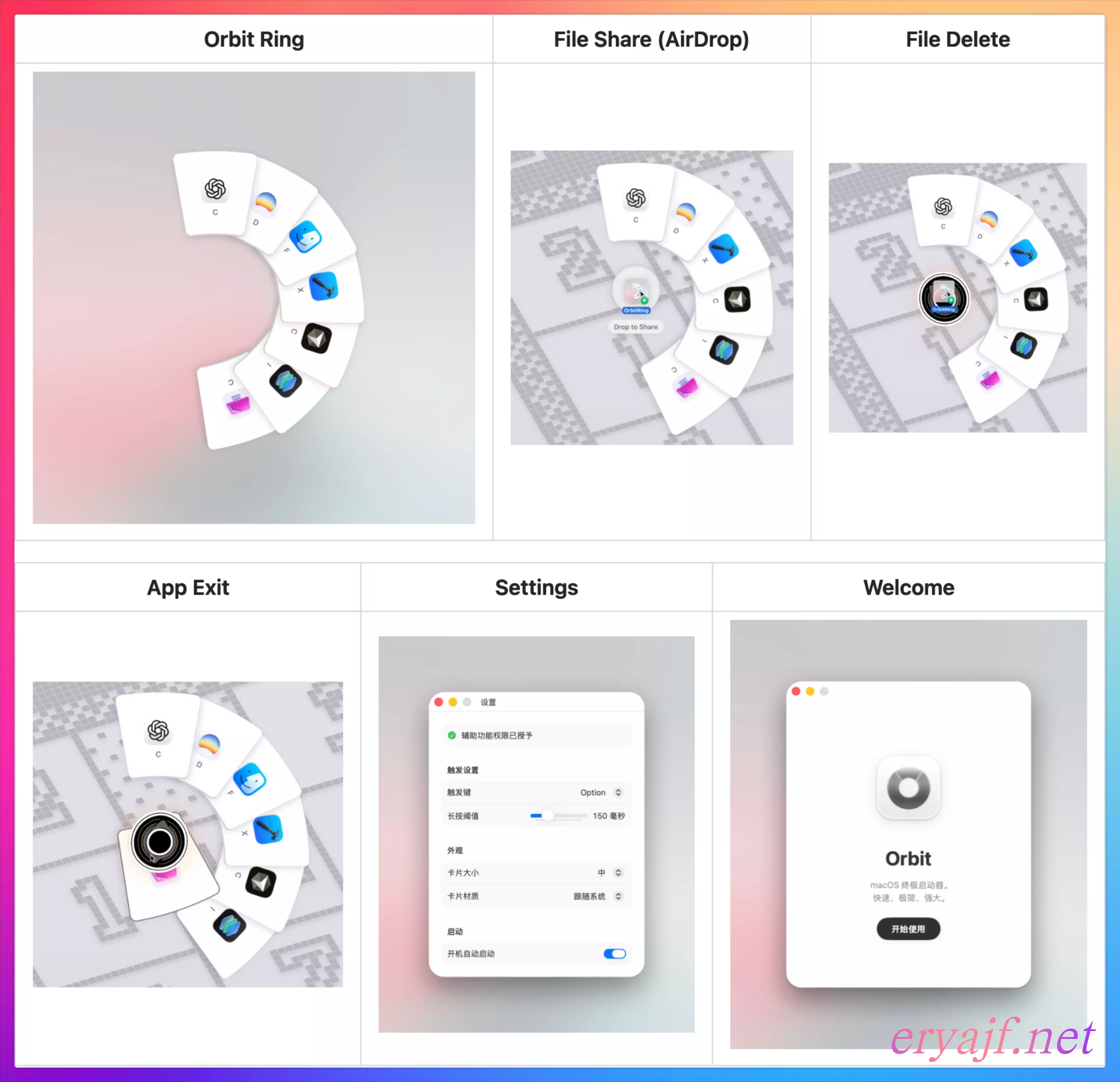 - 项目说明:一款原生的菜单栏效率工具:长按修饰键即可在鼠标附近展开应用环,快速切换、管理应用,并支持文件拖拽分享/删除,所有数据本地处理。