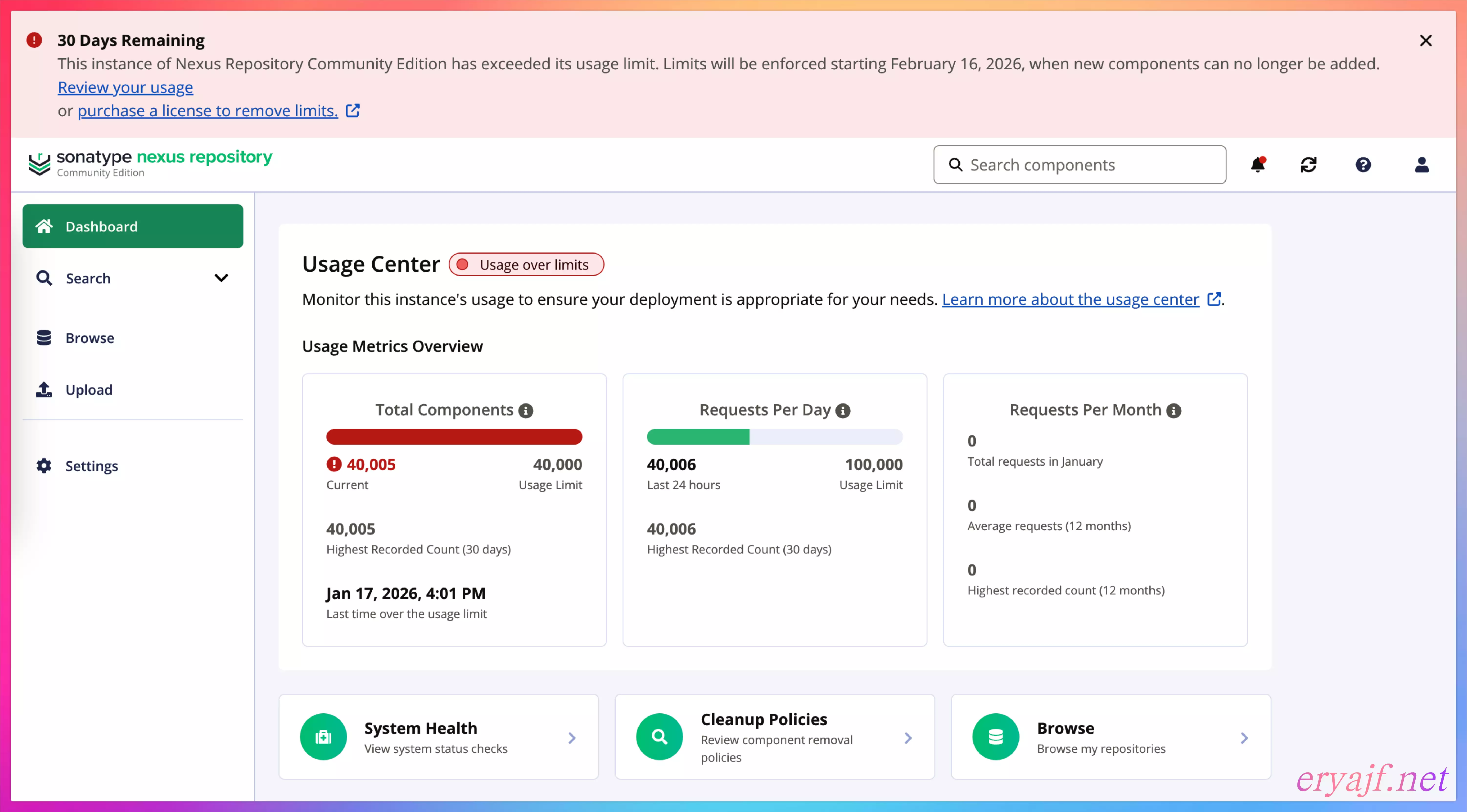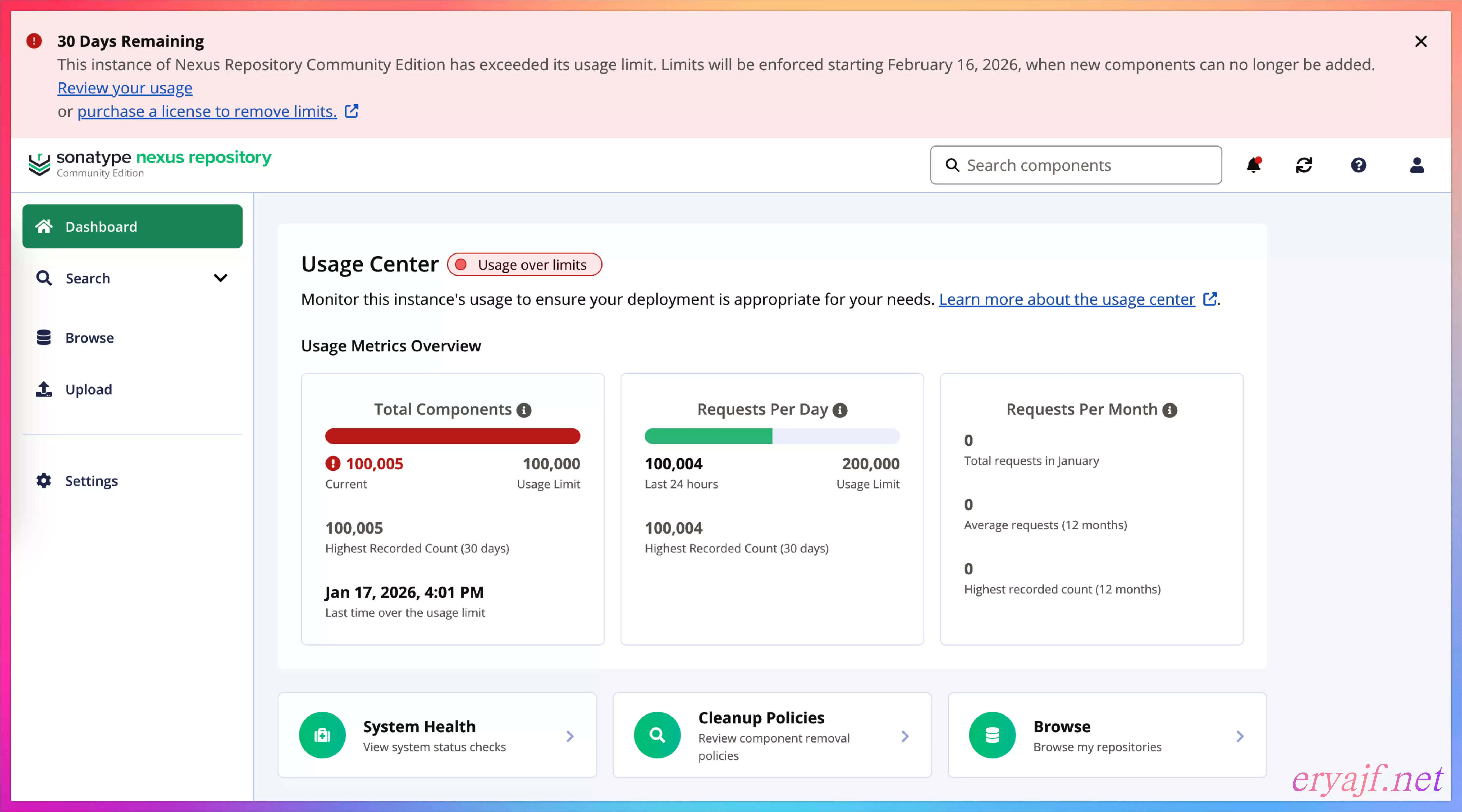 提示:30 Days RemainingThis instance of Nexus Repository Community Edition has exceeded its usage limit. Limits will be enforced starting February 16, 2026, when new components can no longer be added.