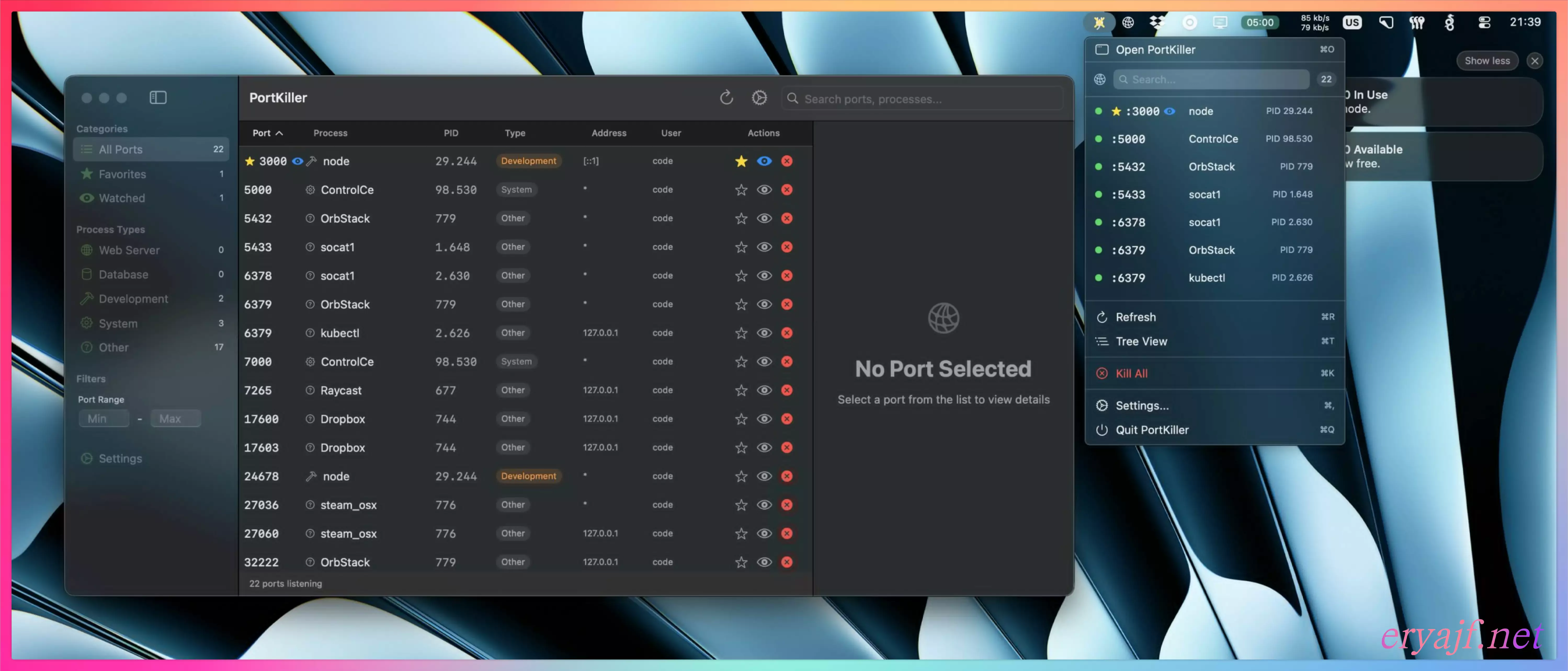 - 项目说明:一款 macOS 原生菜单栏应用,用于查找并终止占用监听端口的进程。我个人平时使用 utools 的插件来实现此操作。